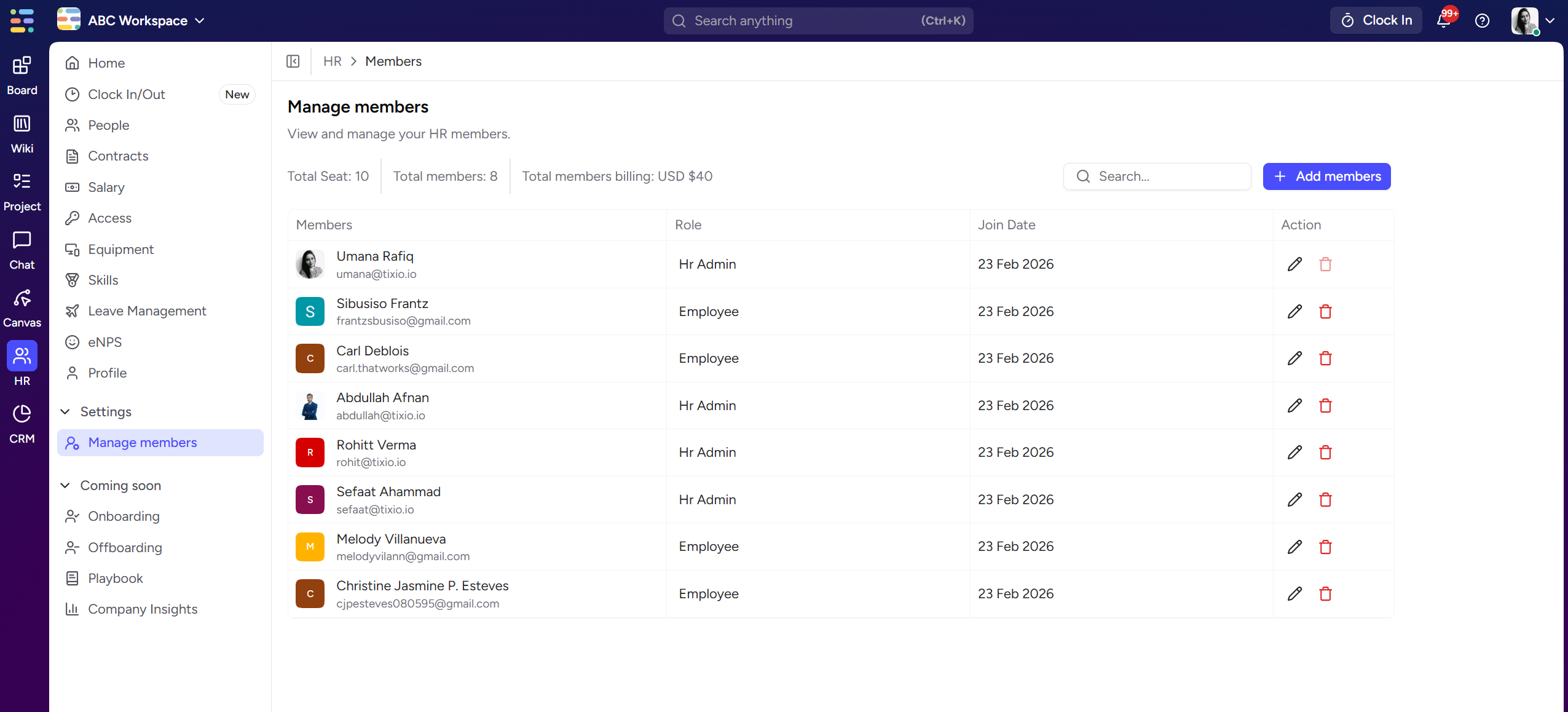 To add people in Tixio HR module, you need to invite them in the workspace or add from existing workspace members.