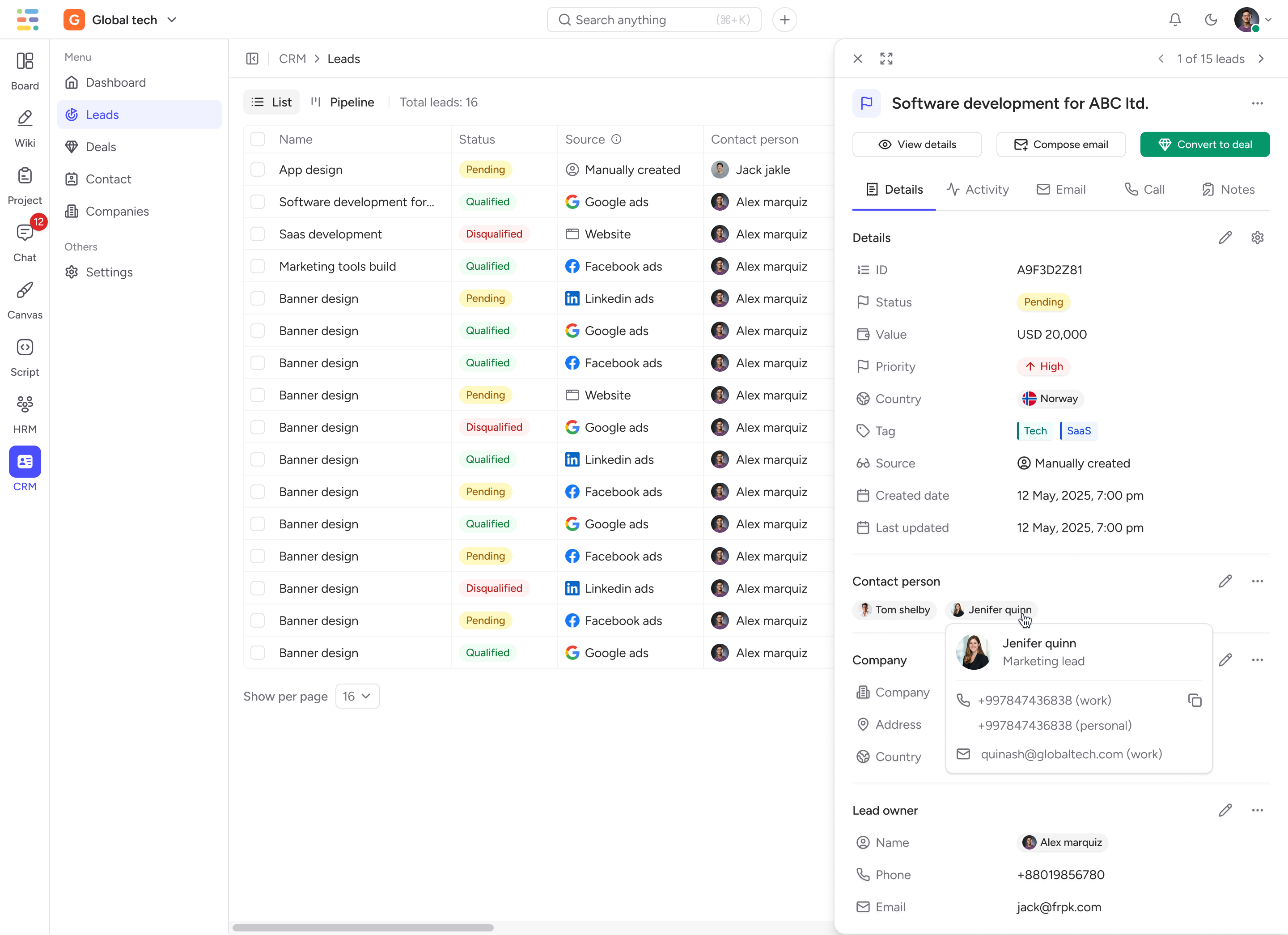 Leads are new prospects who have shown interest in your business but are not yet qualified. In Tixio CRM, leads are collected from multiple sources and organized in one place for easy follow-up. Each lead includes full details, activity history, and notes so your team can qualify them quickly and move them into the sales pipeline with confidence.