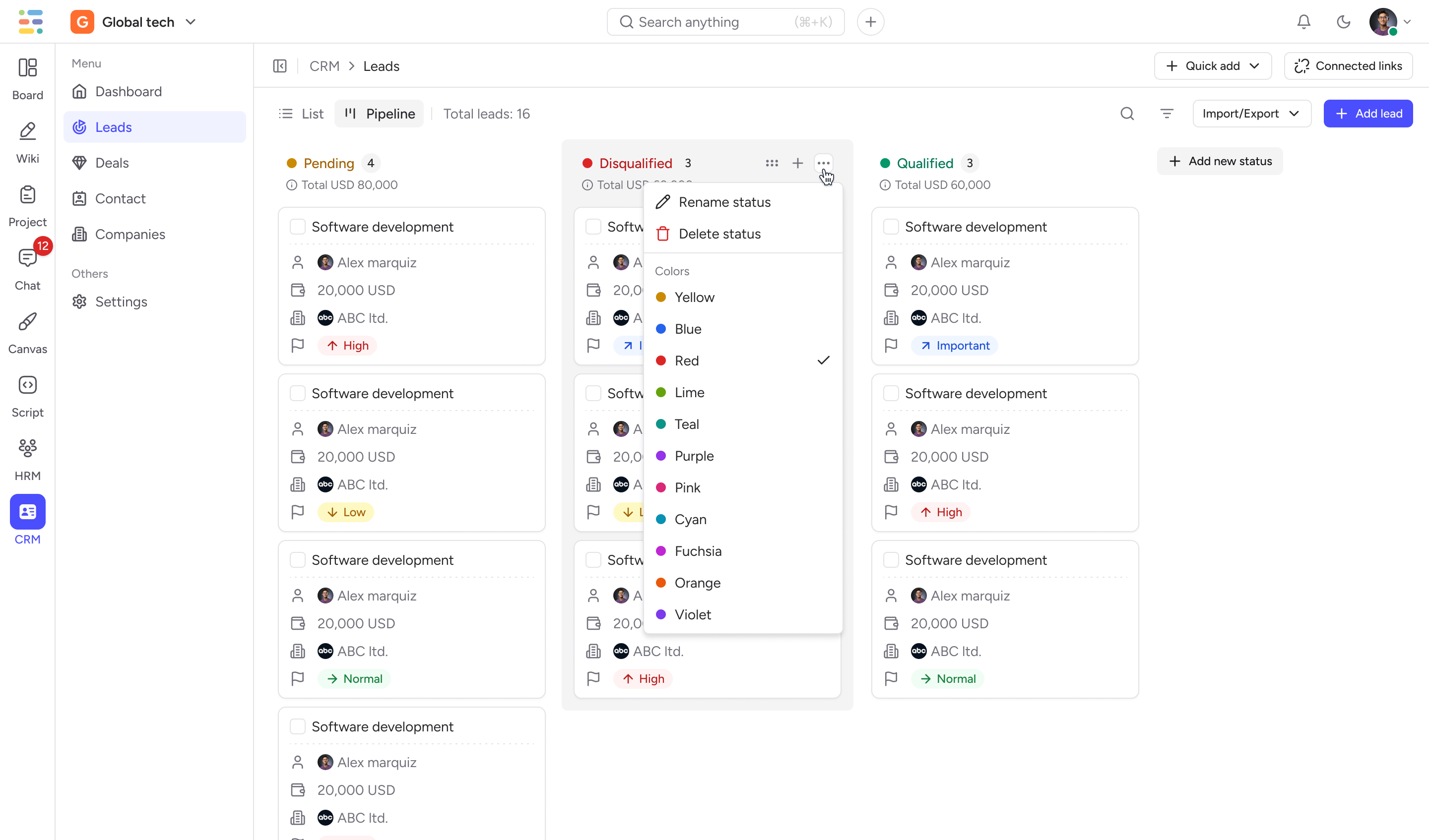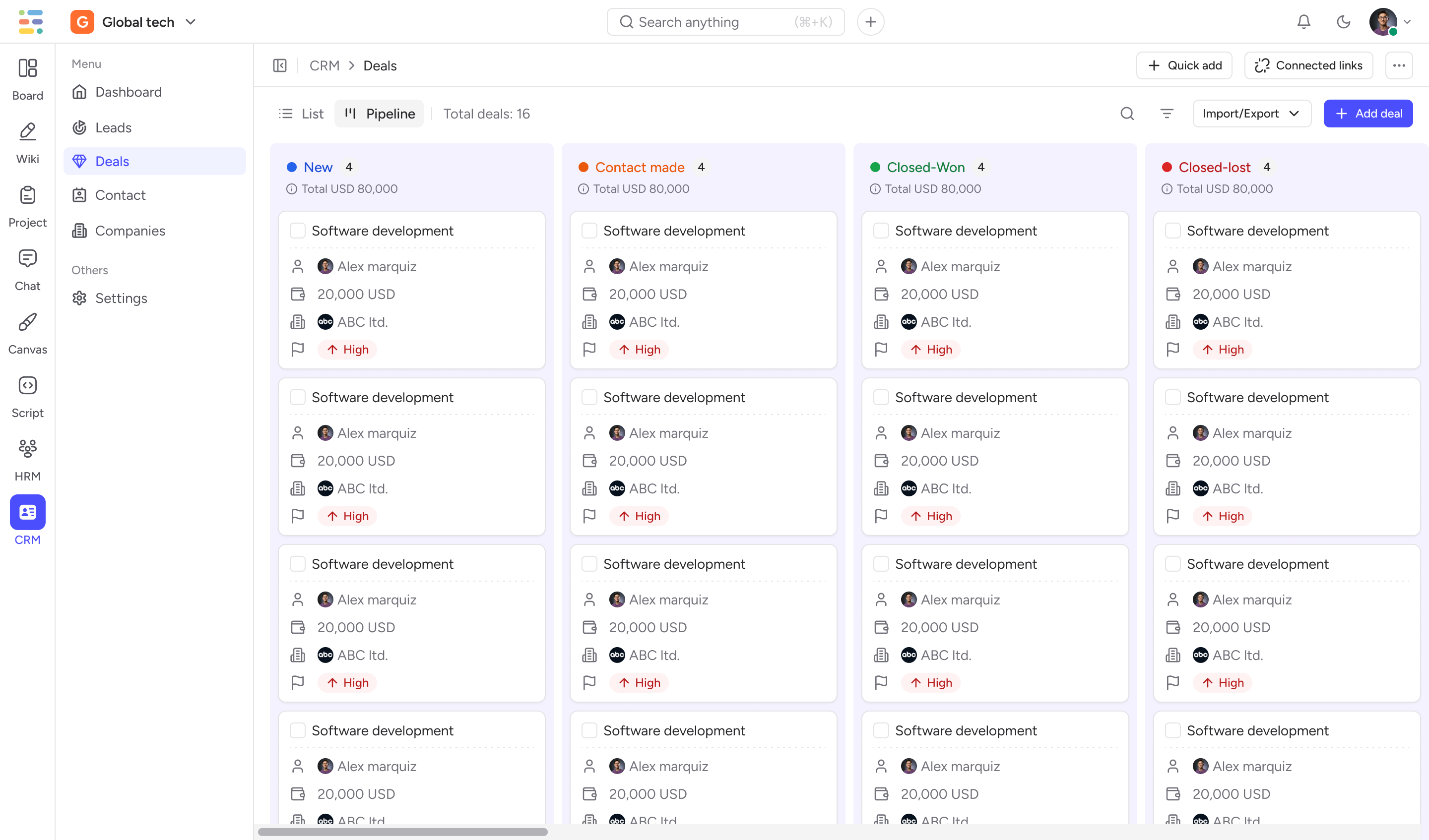 Tixio CRM is built to help teams manage leads, deals, contacts, pipelines, and sales activity in one simple, clean, unified workspace. Designed for fast-moving teams, it connects naturally with the rest of Tixio — boards, projects, docs, notes, and automations — so you're always one step ahead.
