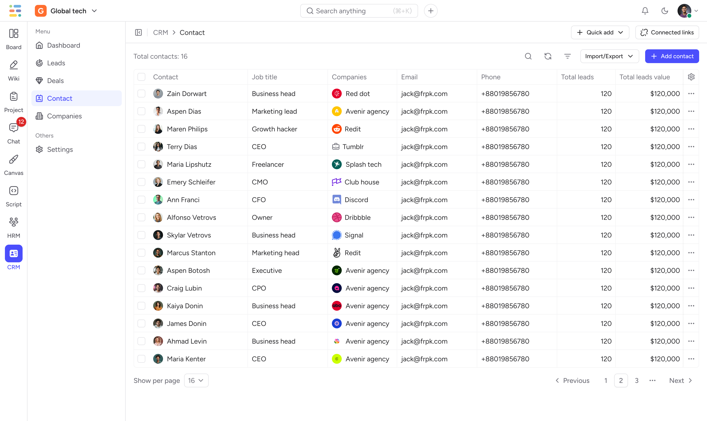 Contacts are the individuals you communicate with - customers, prospects, partners, or stakeholders. Each contact profile consolidates personal details, associated deals, companies, notes, and activity logs. With a structured contact list, your sales team can personalize communication and build stronger, more informed relationships.