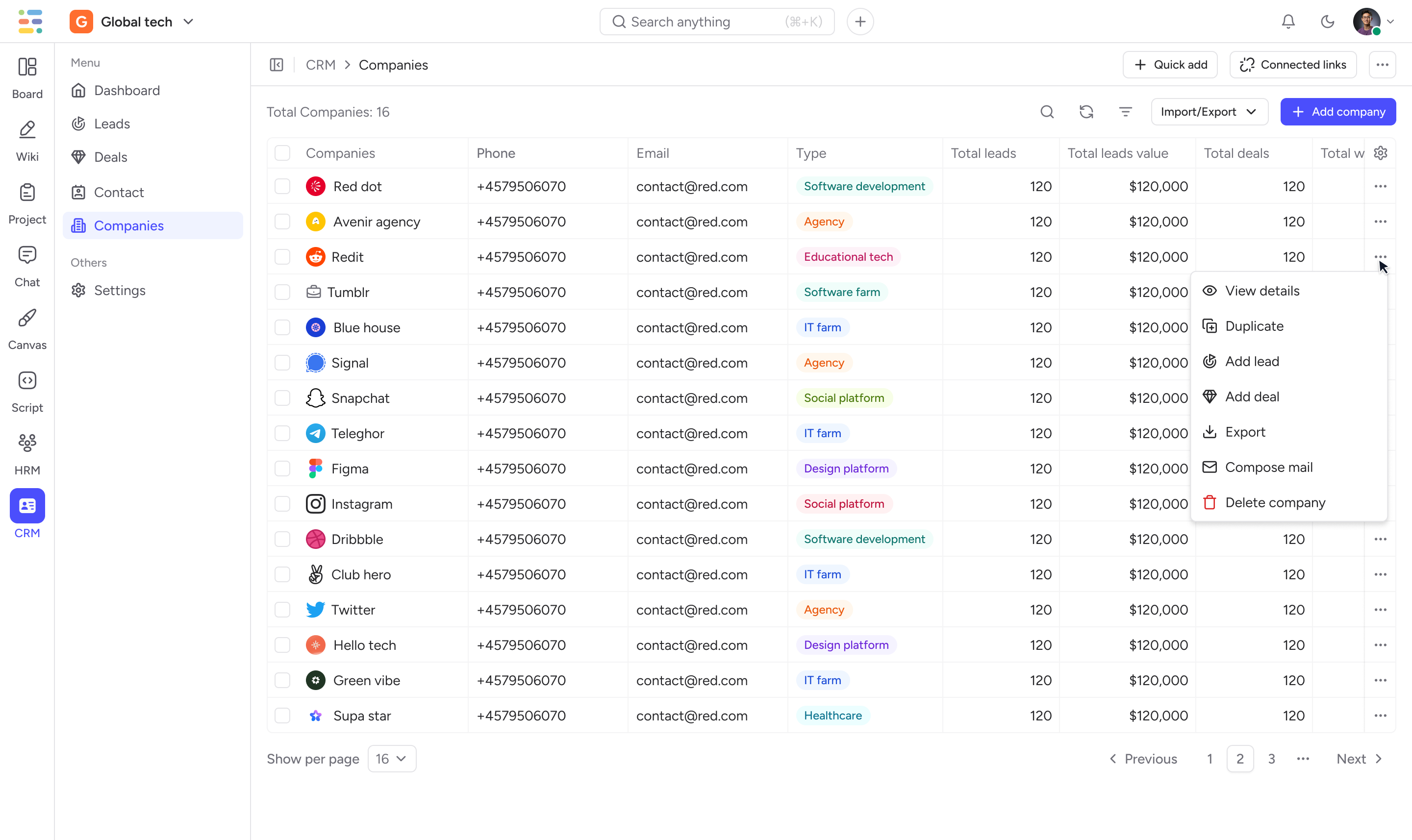 Companies store information about the organizations you work with. You can link multiple contacts, deals, and activities to a single company, giving you a complete view of the business relationship. This helps teams track account-level insights, manage B2B clients more efficiently, and understand how deals and communication flow across the organization.