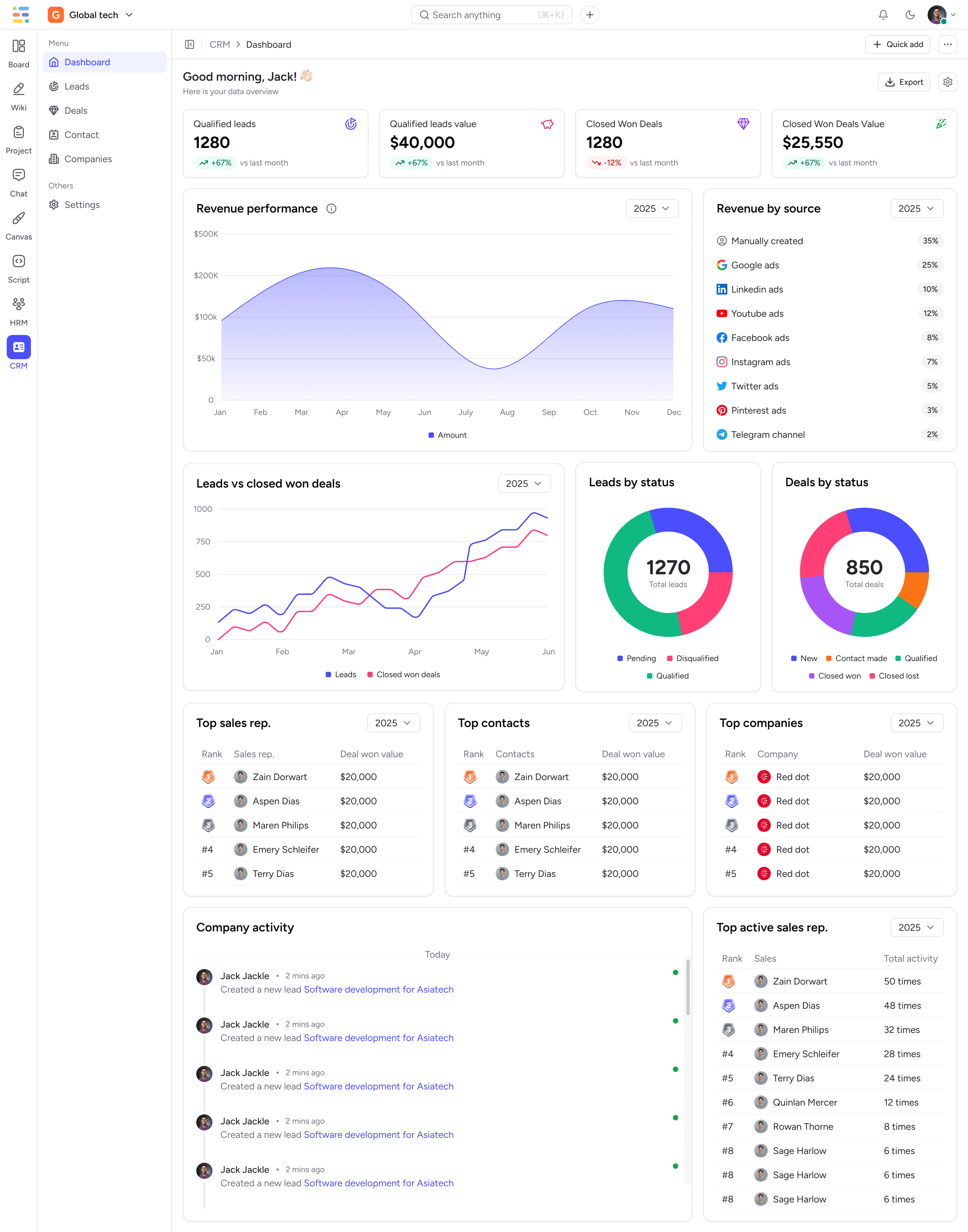 The Dashboard gives you a real-time, high-level overview of your entire sales process. It brings together your leads, deals, revenue forecasts, activities, and team performance into one clean, visual snapshot. Quickly see how many leads are coming in, which deals need attention, how your pipeline is progressing, and where opportunities may be stalling. With charts, metrics, and quick-access widgets, the Dashboard helps you understand the health of your CRM at a glance and make informed decisions without digging through multiple pages.