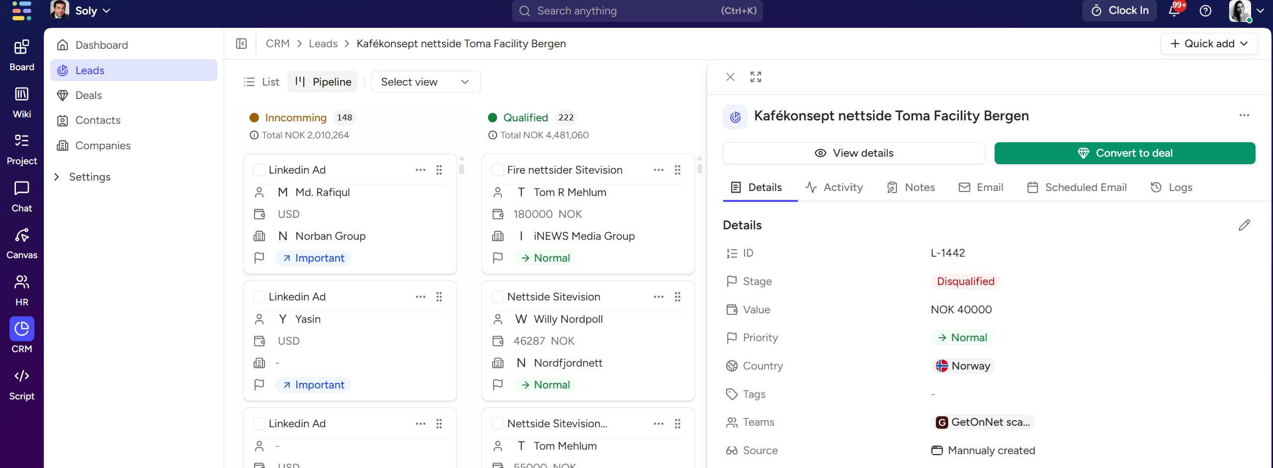 Use Convert to Deal to instantly turn a qualified lead into an active deal in your pipeline.