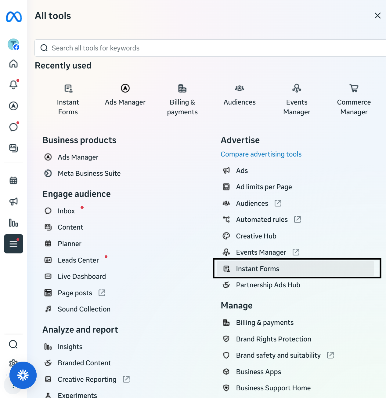 Go to Facebook Business Manager and open Instant Forms from All Tools