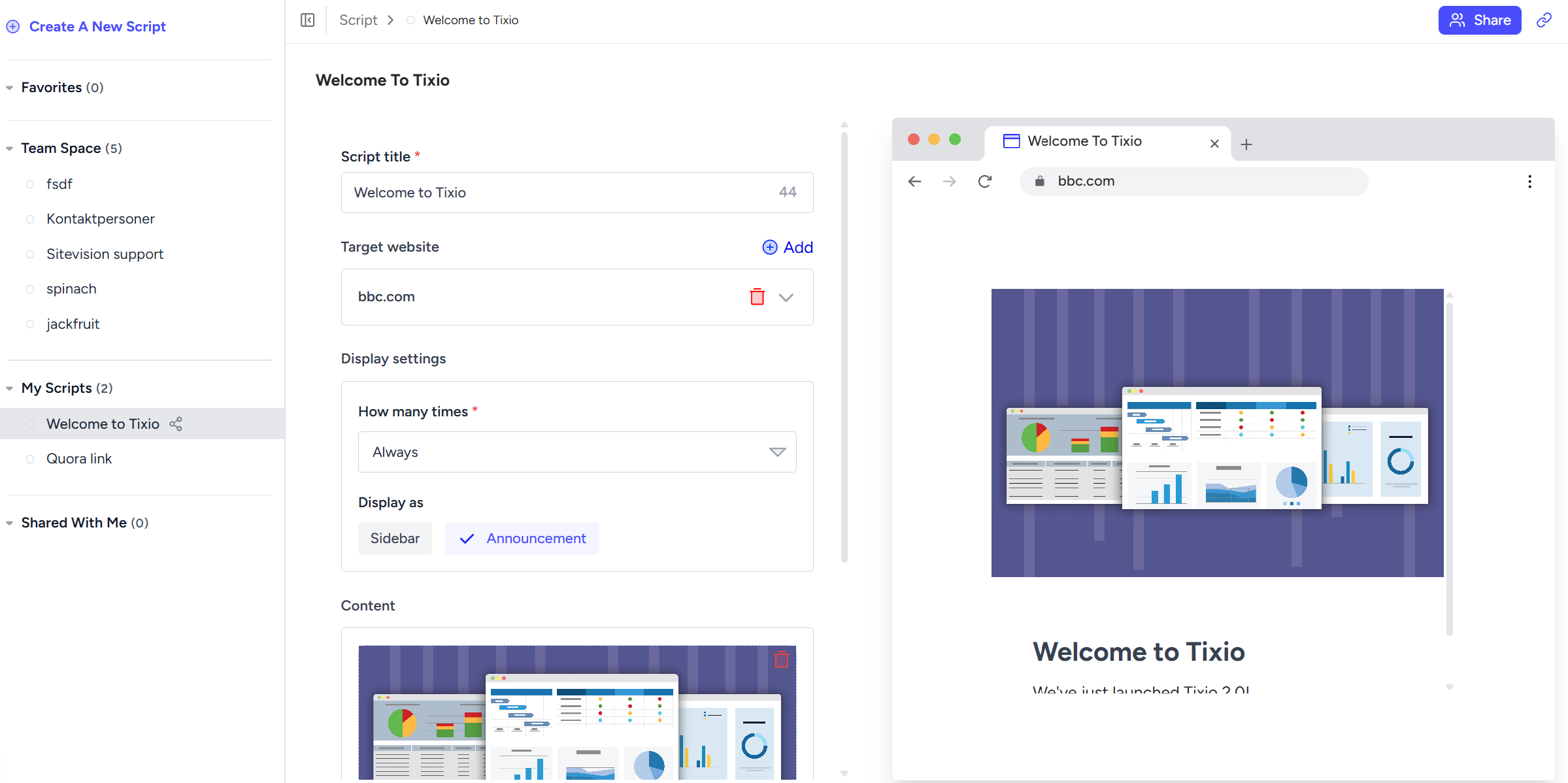 Tixio Script enables smart automation and information sharing on the web using customizable scripts. It lets you share information, links, documents, and announcements that automatically appear on web pages or internal pages - without manual posting.