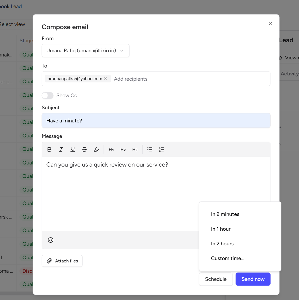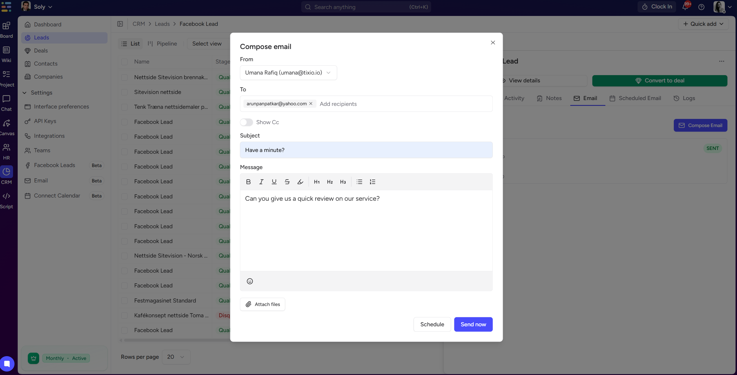 In this article, we will show you how to setup and connect your Gmail with Tixio CRM and send / schedule emails for leads.