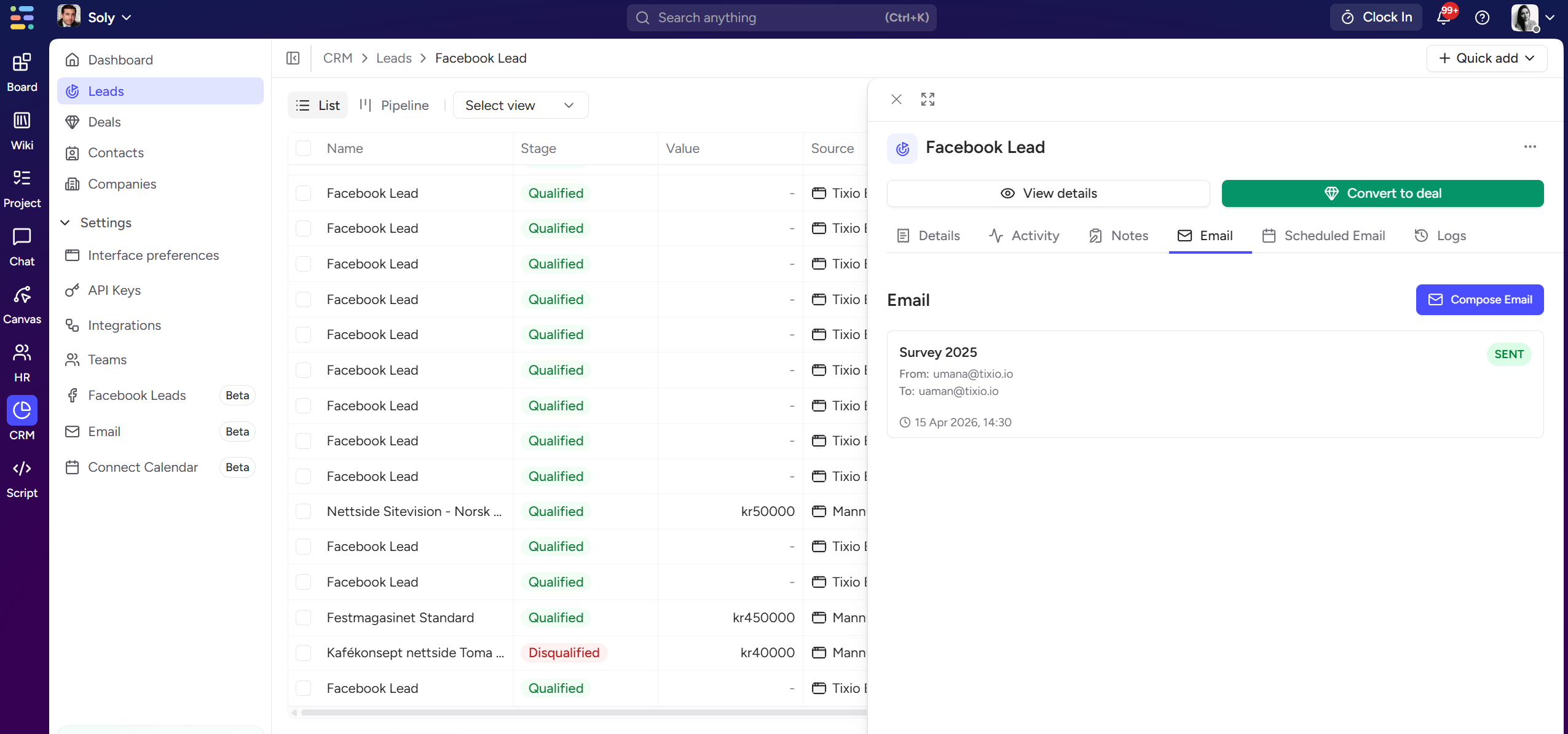 Here you’ll be able to see all the emails you’ve sent so far to this lead from Tixio CRM